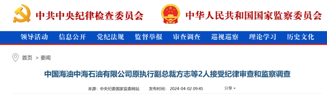 中央紀(jì)委國(guó)家監(jiān)委網(wǎng)站4月2日消息,據(jù)中國(guó)海油紀(jì)檢監(jiān)察組、江蘇省紀(jì)委監(jiān)委消息:中國(guó)海油中海石油有限公司原執(zhí)行副總裁方志、中國(guó)海油中海石油(中國(guó))有限公司天津分公司渤海地區(qū)協(xié)調(diào)工作領(lǐng)導(dǎo)小組原專職副組長(zhǎng)陳明涉嫌嚴(yán)重違紀(jì)違法,目前正接受中國(guó)海油紀(jì)檢監(jiān)察組和江蘇省監(jiān)委紀(jì)律審查和監(jiān)察調(diào)查。