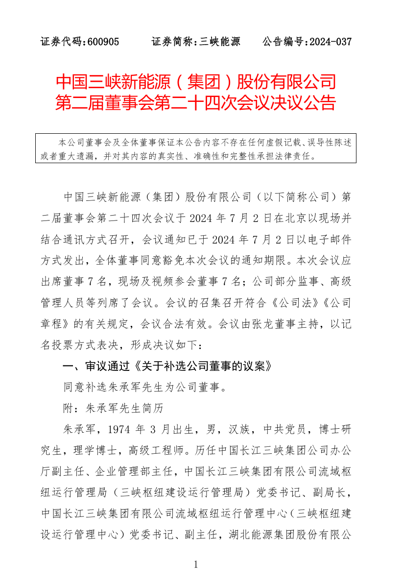 7月2日,三峽能源發(fā)布公告稱,公司第二屆董事會(huì)第二十四次會(huì)議于7月2日召開(kāi)。會(huì)議審議通過(guò)《關(guān)于補(bǔ)選公司董事的議案》, 同意補(bǔ)選朱承軍先生為公司董事。