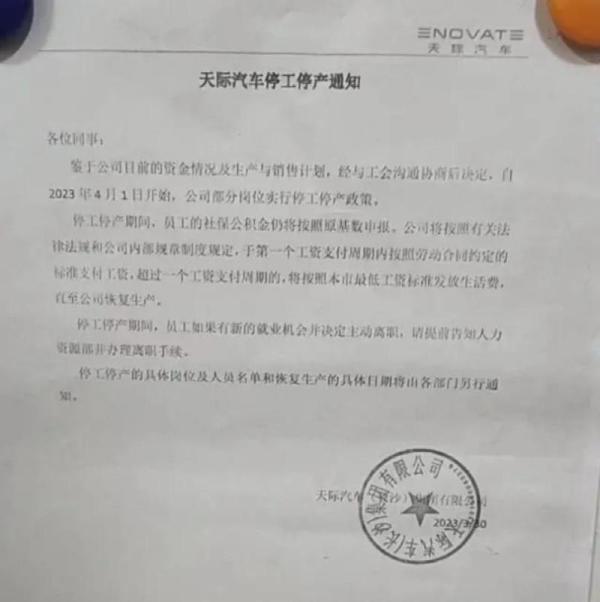 據(jù)天際汽車發(fā)布的停工停產(chǎn)通知,鑒于公司目前的資金情況及生產(chǎn)與銷售計(jì)劃,自2023年4月1日開(kāi)始,公司部分崗位實(shí)行停工停產(chǎn)政策。
