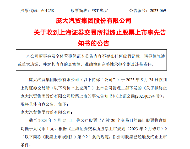 《告知書》顯示,截至2023年5月24日,龐大集團(tuán)股票收盤價(jià)已連續(xù)20個(gè)交易日低于人民幣1元,根據(jù)《上海證券交易所股票上市規(guī)則(2023年2月修訂)》規(guī)定,龐大集團(tuán)股票已經(jīng)觸及終止上市條件,上交所依據(jù)相關(guān)規(guī)定對龐大集團(tuán)股票作出終止上市的決定。