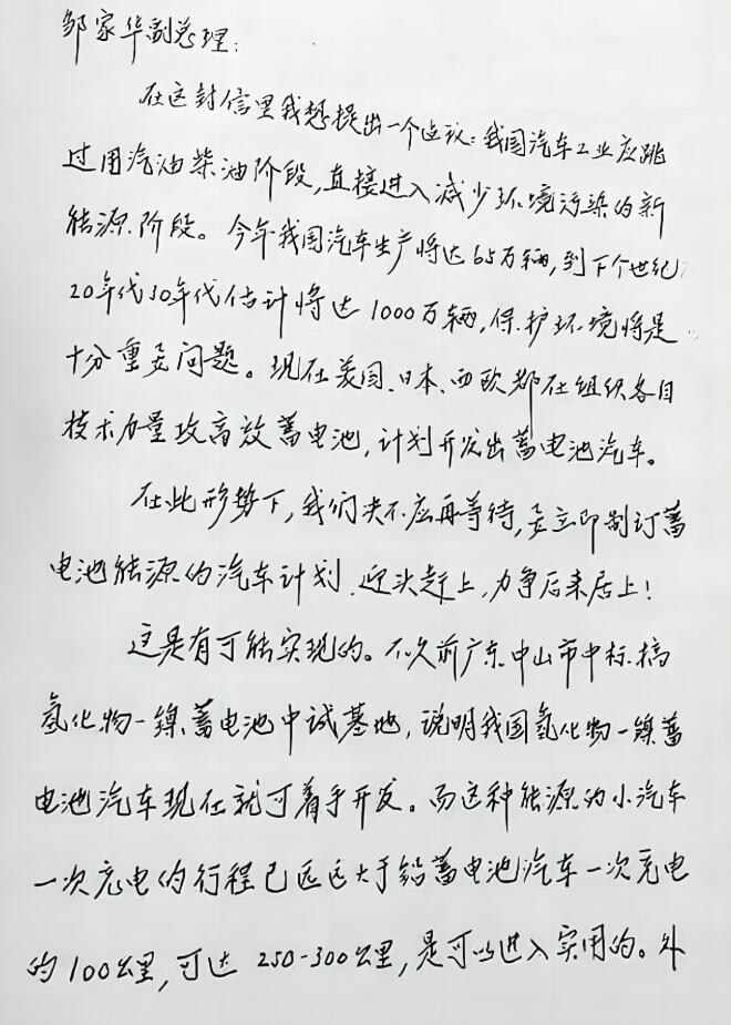 1992年,當時已81歲高齡的錢學森寫信給時任副總理鄒家華,提出了一個高瞻遠矚的建議:“我國汽車工業(yè)應跳過用汽油柴油階段,直接進入減少環(huán)境污染的新能源階段……到下個世紀20年代保護環(huán)境將是十分重要問題?,F在美國、日本、西歐都在組織各自技術力量攻高效蓄電池,計劃開發(fā)出蓄電池汽車。”