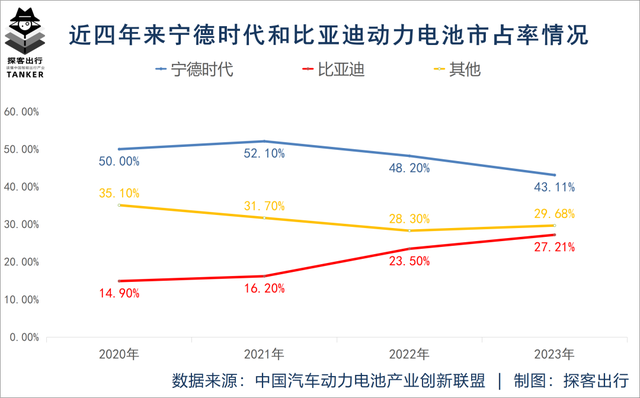 雖說,寧德時(shí)代在2023年國內(nèi)動力電池市場的市占率位居全行業(yè)第一,高達(dá)43.11%,但相比于2021年高達(dá)52.10%的市占率,已經(jīng)出現(xiàn)了明顯下滑。