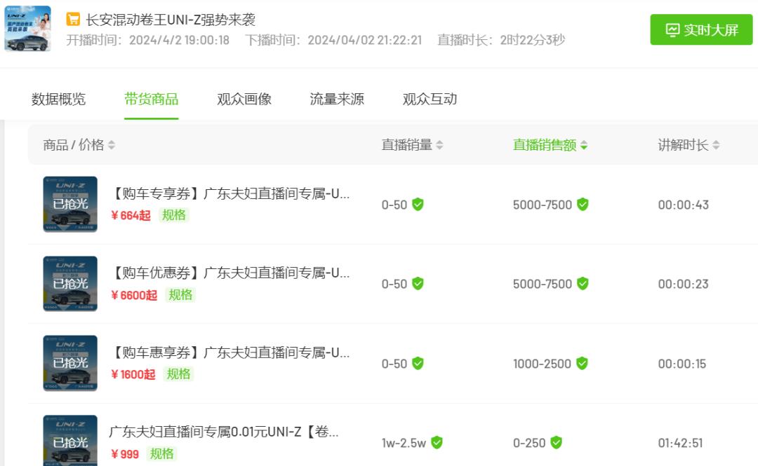 廣東夫婦長安汽車帶貨專場的所有商品均為“購車優(yōu)惠券”,同樣為長安汽車站臺的瘋狂小楊哥帶貨商品也以購車權(quán)益和購車抵扣券為主,后者價(jià)格也極其低廉均為0.01元,主打一個(gè)“交個(gè)朋友”。