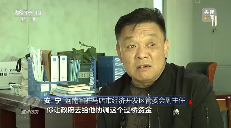 河南省駐馬店市經(jīng)濟(jì)開發(fā)區(qū)管委會(huì)副主任安寧:過橋資金2800萬,他自己拿不起,讓政府協(xié)調(diào)過橋資金,政府又為了免于擔(dān)風(fēng)險(xiǎn),幾經(jīng)努力,最后這個(gè)事沒有做成。說是為了免擔(dān)風(fēng)險(xiǎn),區(qū)政府沒有幫助協(xié)調(diào)下過橋資金,但是,也沒有履行確保恒豐公司用電負(fù)荷的約定。當(dāng)?shù)亟o產(chǎn)業(yè)園提供的一直是建設(shè)廠房時(shí)的臨時(shí)用電,220千伏變電站沒有如期建成,對(duì)企業(yè)造成的影響,當(dāng)?shù)卣质侨绾慰创哪?河南省駐馬店市經(jīng)濟(jì)開發(fā)區(qū)管委會(huì)副主任安寧:電力接上了,是臨時(shí)用電,建設(shè)期都給接了。記者:電力保障在前,還是應(yīng)該生產(chǎn)在前?河南省駐馬店市經(jīng)濟(jì)開發(fā)區(qū)管委會(huì)副主任安寧:電力保障在前。記者:正式用電的電力保障一直沒有進(jìn)行的原因是什么呢?河南省駐馬店市經(jīng)濟(jì)開發(fā)區(qū)管委會(huì)副主任安寧:這個(gè)你要問當(dāng)事人。