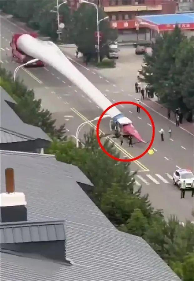 現(xiàn)場視頻顯示,一輛運(yùn)輸風(fēng)力發(fā)電機(jī)葉片的貨車停在路上,一輛面包車被葉片刺穿,面包車內(nèi)有人被困,民警和救援人員已到場處置。