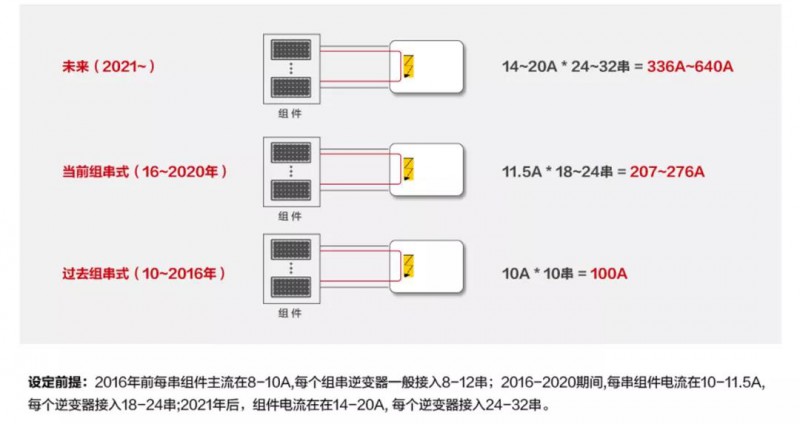隨著硅片尺寸越來(lái)越大以及電池效率越來(lái)越高,組件電流不斷提高成為必然趨勢(shì)。我們看到,組件電流越來(lái)越大,逆變器功率或匯流箱對(duì)應(yīng)的組串?dāng)?shù)量也不斷增加。