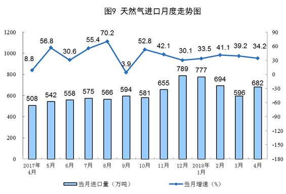 天然氣進(jìn)口連續(xù)7個(gè)月保持30%以上的高速增長(zhǎng)。4月份,天然氣進(jìn)口682萬噸,同比增長(zhǎng)34.2%,增速比上月回落5個(gè)百分點(diǎn)。1-4月份,進(jìn)口天然氣2742萬噸,同比增長(zhǎng)36.4%。