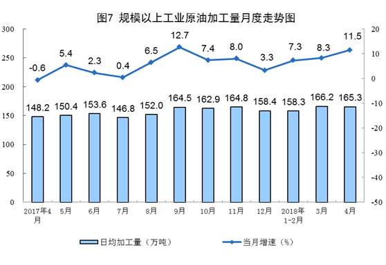 受去年同期大型石化企業(yè)停產(chǎn)檢修較多,以及今年原油進(jìn)口配額和成品油出口配額均大幅增加等多重因素影響,原油加工量增長(zhǎng)較快。4月份,原油加工量4958萬噸,同比增長(zhǎng)11.5%,比上月加快3.2個(gè)百分點(diǎn);日均加工165.3萬噸,比上月減少0.9萬噸。