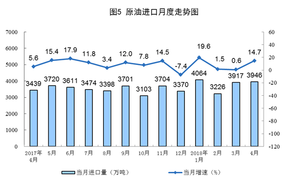 4月份,原油進(jìn)口大幅增長(zhǎng),進(jìn)口3946萬噸,同比增長(zhǎng)14.7%,增速比上月加快14.1個(gè)百分點(diǎn);日均進(jìn)口131.5萬噸,再創(chuàng)歷史新高。1-4月份,進(jìn)口原油1.5億噸,同比增長(zhǎng)8.9%。