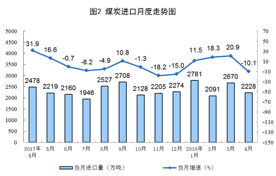 煤炭進(jìn)口大幅下降。4月份,進(jìn)口煤炭2228萬噸,同比下降10.1%。1-4月份,進(jìn)口煤炭9768萬噸,同比增長(zhǎng)9.3%。