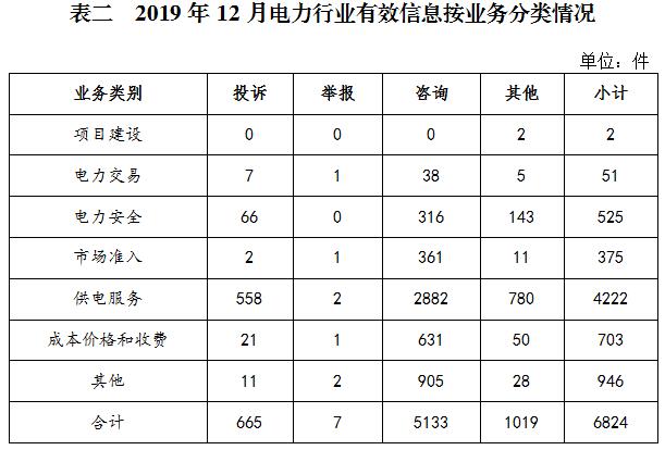 電力行業(yè)排在首位,有效信息數(shù)量為6824件,占全部有效信息的81.05%;其中受理的投訴舉報(bào)數(shù)量為672件,占全部投訴舉報(bào)數(shù)量的97.39%。群眾反映的問(wèn)題主要集中在供電服務(wù)、電力安全、成本價(jià)格和收費(fèi)等方面。(2019年11月電力行業(yè)有效信息按業(yè)務(wù)分類情況見(jiàn)表二)