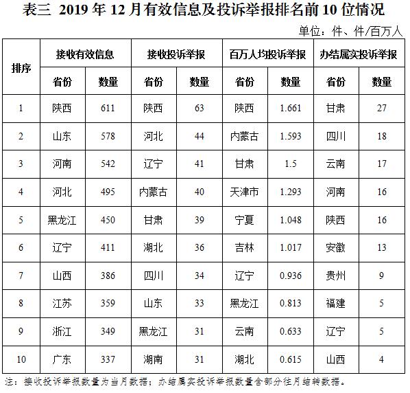 各省(自治區(qū)、直轄市)按照收到的有效信息數(shù)量排序,陜西、山東、河南、河北、黑龍江等列全國(guó)前10位;按照投訴舉報(bào)數(shù)量排序,陜西、河北、遼寧、內(nèi)蒙古、甘肅等排在全國(guó)前10位;按照百萬(wàn)人均投訴舉報(bào)數(shù)量排序,陜西,內(nèi)蒙古,甘肅,天津市,寧夏等排在全國(guó)前10位;按照辦結(jié)屬實(shí)投訴舉報(bào)數(shù)量排序,甘肅、四川、云南、河南、陜西等排在全國(guó)前10位。(2019年12月有效信息及投訴舉報(bào)排名前10位情況見(jiàn)表三)