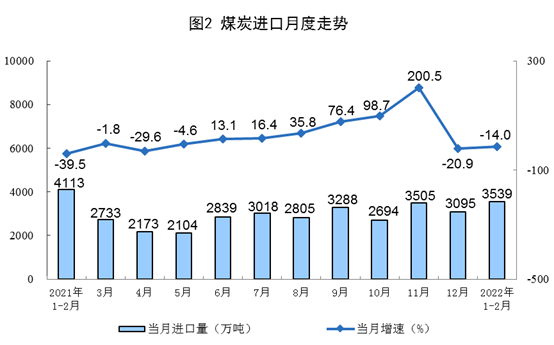 原煤生產(chǎn)較快增長,進(jìn)口降幅收窄。1—2月份,生產(chǎn)原煤6.9億噸,同比增長10.3%,增速比上年12月份加快3.1個百分點(diǎn),日均產(chǎn)量1164萬噸。進(jìn)口煤炭3539萬噸,同比下降14.0%,降幅比上年12月份收窄6.9個百分點(diǎn)。