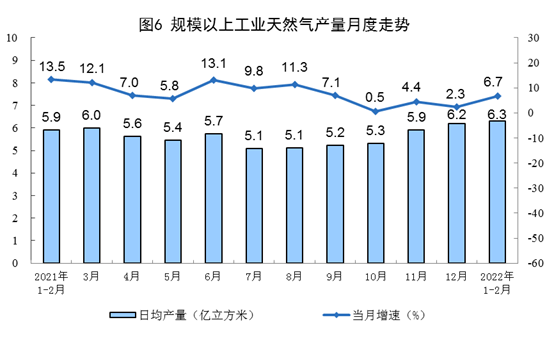 天然氣生產(chǎn)保持增長,進(jìn)口下降。1—2月份,生產(chǎn)天然氣372億立方米,同比增長6.7%,增速比上年12月份加快4.4個百分點(diǎn),日均產(chǎn)量6.3億立方米。進(jìn)口天然氣1986萬噸,同比下降3.8%,上年12月份為增長4.6%。