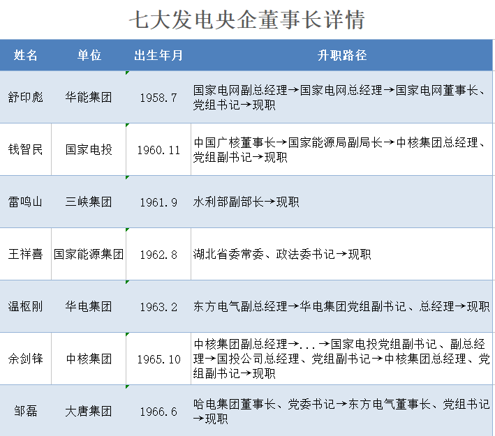 7位發(fā)電央企董事長的詳細檔案(按年齡排序)