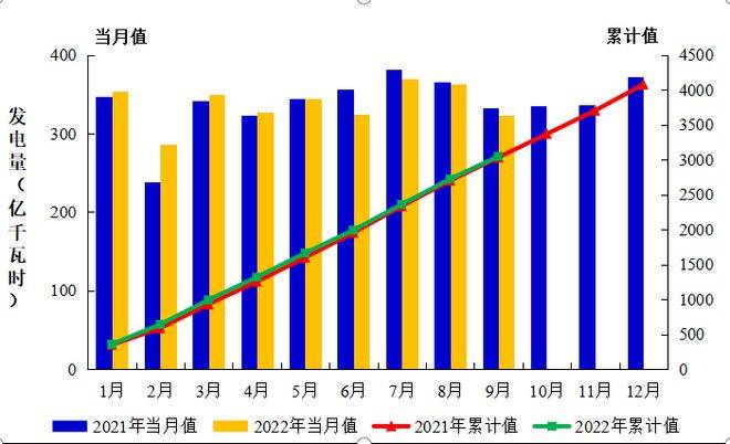 圖2:2021年1月至2022年9月全國運(yùn)行核電機(jī)組發(fā)電量趨勢