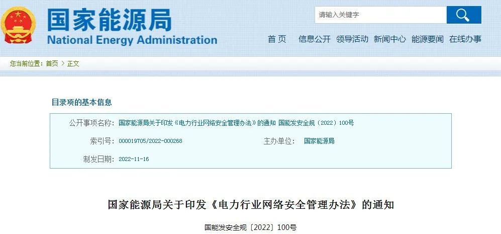 12月12日,國(guó)家能源局發(fā)布《電力行業(yè)網(wǎng)絡(luò)安全管理辦法》。