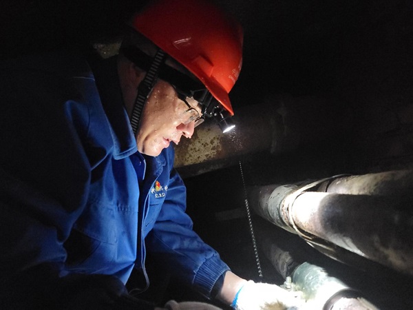 狹窄的通道內(nèi),張軍半躬著身體曲腿前行,一邊聽著呲水聲一邊摸索著前進(jìn),在離井口5米處找到了正在不斷呲水的漏點(diǎn)。他蹲在漏點(diǎn)旁,嘴中含著手電筒,將管卡覆蓋漏點(diǎn),顧不得強(qiáng)烈的水流順著管卡噴濺到身上。由于八道螺絲需要均勻受力反復(fù)緊扣,在不足半米的空間內(nèi),他使出渾身力氣擰著螺絲。當(dāng)泄漏封堵完成,張軍從井里爬出來時(shí),渾身都已被水呲透。