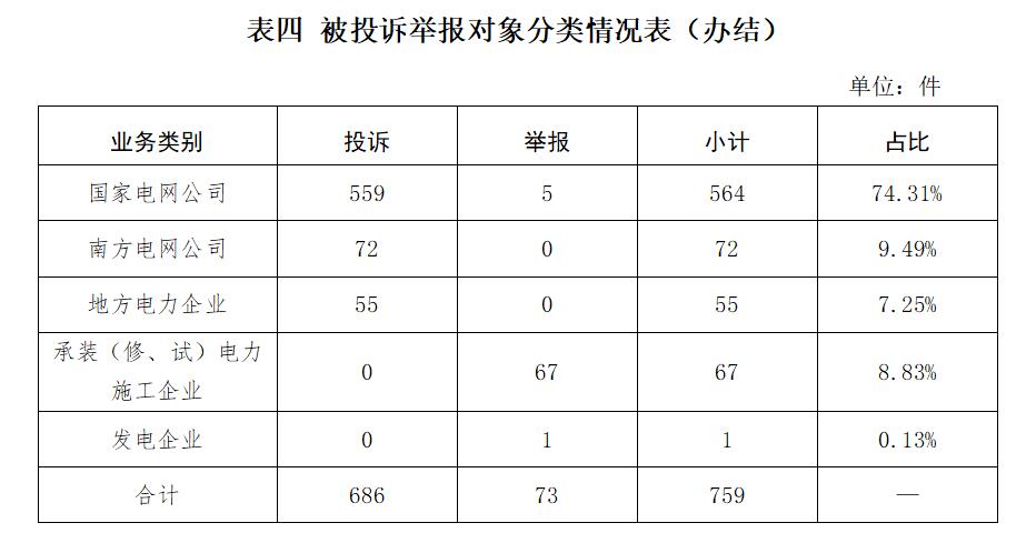 從被投訴舉報(bào)對(duì)象看,供電企業(yè)691件、占比91.04%,其中國(guó)家電網(wǎng)公司564件、占比74.31%,南方電網(wǎng)公司72件、占比9.49%,地方電力企業(yè)55件、占比7.25%;承裝(修、試)電力施工企業(yè)投訴舉報(bào)67件、占比8.83%;新能源企業(yè)投訴舉報(bào)1件、占比0.13%。(詳見表四)