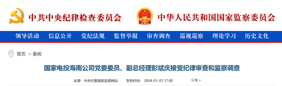 國家電投海南公司黨委委員、副總經(jīng)理彭斌慶被查!