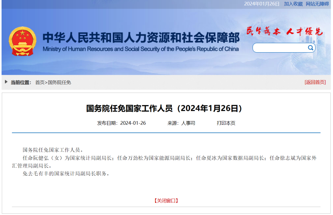 任命阮健弘(女)為國家統(tǒng)計(jì)局副局長;任命萬勁松為國家能源局副局長;任命夏冰為國家數(shù)據(jù)局副局長;任命徐志斌為國家外匯管理局副局長。