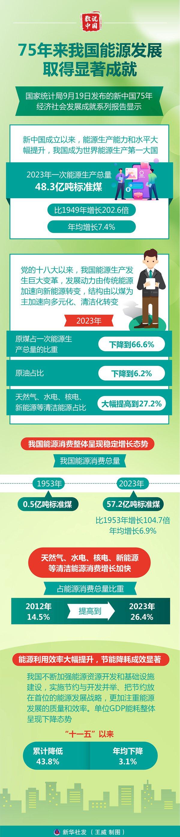 國(guó)家統(tǒng)計(jì)局19日發(fā)布的新中國(guó)75年經(jīng)濟(jì)社會(huì)發(fā)展成就系列報(bào)告顯示,75年來(lái),我國(guó)能源發(fā)展取得顯著成就,供應(yīng)保障能力持續(xù)增強(qiáng),綠色低碳轉(zhuǎn)型深入推進(jìn),能源利用效率不斷提升,節(jié)能降耗成效明顯。