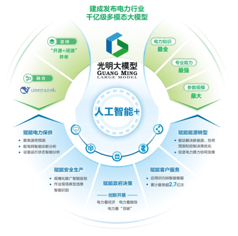 實(shí)施“人工智能+”專(zhuān)項(xiàng)行動(dòng),建成發(fā)布電力行業(yè)千億級(jí)多模態(tài)大模型——光明大模型。