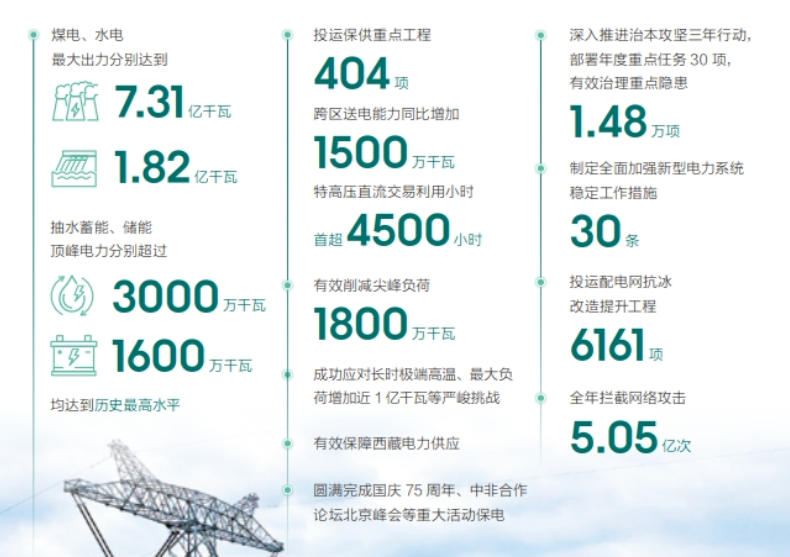 投運(yùn)保供重點(diǎn)工程404項(xiàng)、配電網(wǎng)抗冰改造提升工程6161項(xiàng),攔截網(wǎng)絡(luò)攻擊5.05億次,成功應(yīng)對(duì)長(zhǎng)時(shí)極端高溫、最大負(fù)荷增加近1億千瓦等嚴(yán)峻挑戰(zhàn),解決配電網(wǎng)抗災(zāi)脆弱性問(wèn)題,消除縣域聯(lián)系薄弱等網(wǎng)架結(jié)構(gòu)短板。