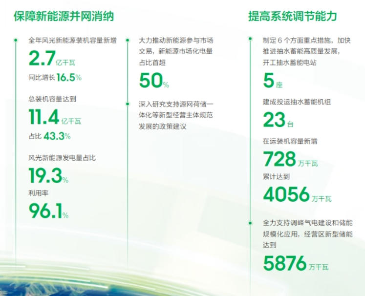 促進(jìn)新能源高質(zhì)量發(fā)展,經(jīng)營(yíng)區(qū)三批大基地項(xiàng)目累計(jì)并網(wǎng)容量1.06億千瓦;加快低壓分布式光伏柔性改造,實(shí)現(xiàn)功率柔性可調(diào)238萬(wàn)戶(hù);全年風(fēng)光新能源裝機(jī)容量新增2.7億千瓦,同比增長(zhǎng)16.5%;風(fēng)光新能源發(fā)電量占比19.3%,利用率96.1%;開(kāi)工抽水蓄能電站5座,建成投運(yùn)抽水蓄能機(jī)組23臺(tái),在運(yùn)裝機(jī)容量累計(jì)達(dá)到4056萬(wàn)千瓦;經(jīng)營(yíng)區(qū)新型儲(chǔ)能達(dá)到5876萬(wàn)千瓦。