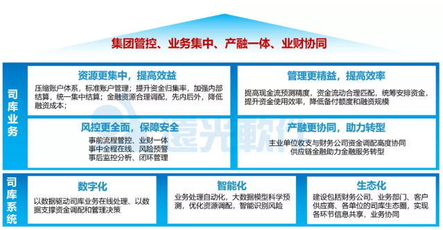 結(jié)合集團(tuán)企業(yè)發(fā)展需求和業(yè)界實(shí)踐經(jīng)驗(yàn),司庫(kù)管理體系建設(shè)需滿(mǎn)足“資源更集中、管理更精益、風(fēng)控更全面、產(chǎn)融更協(xié)同”四個(gè)標(biāo)準(zhǔn),以數(shù)字化、智能化的司庫(kù)管理信息系統(tǒng)為支撐,以“集團(tuán)管控、業(yè)務(wù)集中、產(chǎn)融一體、業(yè)務(wù)協(xié)同”為管理目標(biāo)。