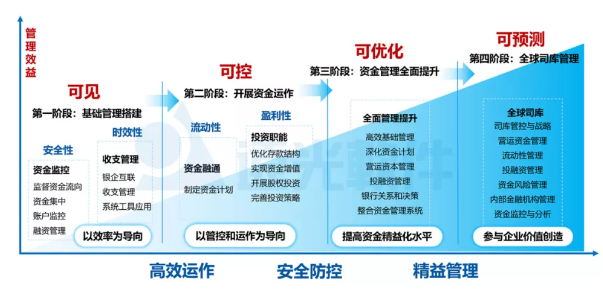 司庫(kù)管理注重強(qiáng)化營(yíng)運(yùn)資金、流動(dòng)性、資本結(jié)構(gòu)、利率匯率風(fēng)險(xiǎn)和融資的管控,通過(guò)司庫(kù)體系建設(shè),企業(yè)可將資金被動(dòng)管理轉(zhuǎn)變?yōu)橹鲃?dòng)管理、超前管理,實(shí)現(xiàn)集團(tuán)各類(lèi)金融資源可視、可控和增值,成為集團(tuán)戰(zhàn)略落地的堅(jiān)實(shí)保障。