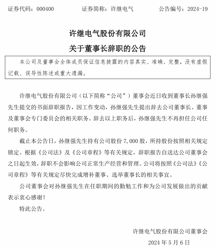 5月5日,許繼電氣發(fā)布公告,董事會(huì)近日收到董事長(zhǎng)孫繼強(qiáng)提交的書面辭職報(bào)告,因工作變動(dòng),孫繼強(qiáng)提出辭去公司董事長(zhǎng)、董事及董事會(huì)專門委員會(huì)的相關(guān)職務(wù)。