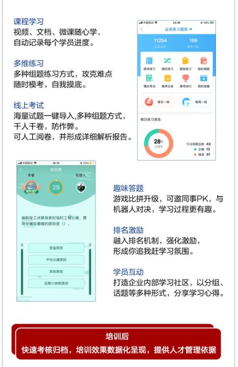 遠光“微學習”運用移動互聯(lián)網(wǎng)、大數(shù)據(jù)、云計算技術,根據(jù)企業(yè)培養(yǎng)計劃,融入培訓管理、學習地圖、課程管理、考試管理、講師管理、學習交流圈等多種場景,對企業(yè)人才培養(yǎng)進行全流程組織、監(jiān)控,助力企業(yè)快速建立新型的高粘性企業(yè)大學,實現(xiàn)高素質(zhì)人才的快速儲備。助您企業(yè)培訓管理,少走彎路!