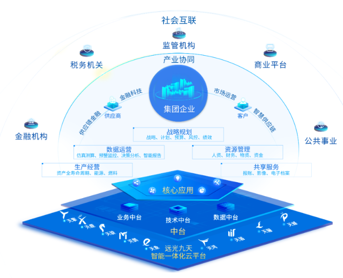 在傳統(tǒng)的企業(yè)內(nèi)部人力、物力、財(cái)力等資源要素管理基礎(chǔ)上,擴(kuò)展戰(zhàn)略規(guī)劃、生產(chǎn)經(jīng)營(yíng)、共享服務(wù)、數(shù)據(jù)運(yùn)營(yíng)等四個(gè)領(lǐng)域的核心應(yīng)用,將先進(jìn)數(shù)字技術(shù)與企業(yè)資源管理、業(yè)務(wù)運(yùn)營(yíng)深度融合,通過一套系統(tǒng)同時(shí)滿足企業(yè)不同層級(jí)、不同業(yè)務(wù)領(lǐng)域的數(shù)字化需求。同時(shí),依托可擴(kuò)展的平臺(tái)能力,共享基于先進(jìn)業(yè)務(wù)實(shí)踐沉淀的新業(yè)務(wù)、新理念管理模型,彈性支撐業(yè)務(wù)發(fā)展,為全業(yè)務(wù)進(jìn)行賦能。