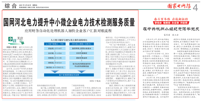 截至3月22日,國網(wǎng)河北省電力有限公司電力科學研究院財務部應用財務自動化處理機器人(RPA) 完成了1000筆與中小微企業(yè)相關的銀行匯款對賬及入賬業(yè)務,每筆業(yè)務耗時不到1分鐘,而過去則需要3~7天。有了財務自動化處理機器人后,中小微企業(yè)獲取相應的技術檢測報告和增值稅專用發(fā)票的時間大幅縮短。