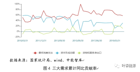 同時,從消費、投資和國外三大需求累計同比對GDP貢獻率看,消費對經(jīng)濟增長的貢獻率逐步成為中流砥柱,而投資形成貢獻率趨于穩(wěn)定。