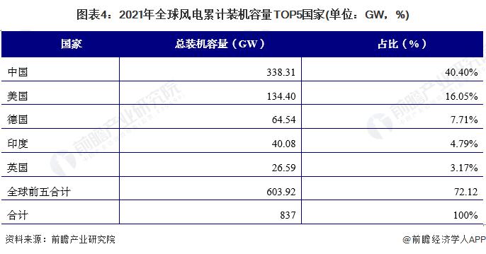截至 2021 年底,全球風(fēng)電裝機(jī)總量 837GW,其中中國位居第一,裝機(jī)總量達(dá) 338.31GW,占世界總裝機(jī)容量的 40.40%; 美國風(fēng)電裝機(jī)總量為 134.40GW,占比為 16.05%,僅次于中國 ; 德國雖然在 2021 年新增裝機(jī)容量不是很多,但作為老牌風(fēng)電強(qiáng)國,累計(jì)裝機(jī)容量仍占了第三的位置,風(fēng)電裝機(jī)總量 64.54GW,占比 7.71%。印度和英國的裝機(jī)總量分別為 40.08GW 和 26.59GW,分別占比 4.79% 和 3.17%。中國和美國風(fēng)電累計(jì)裝機(jī)量占世界總裝機(jī)量的比例超過 50%,前五的國家占比超過 70%。