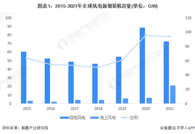 全球風(fēng)能理事會 ( GWEC ) 發(fā)布的《全球風(fēng)能報(bào)告 2022》指出,得益于技術(shù)進(jìn)步和商業(yè)模式創(chuàng)新,風(fēng)能行業(yè)正在快速發(fā)展,2021 年全球新增風(fēng)電裝機(jī)容量 93.6GW,較 2020 年下降 1.8%。其中陸上風(fēng)電新增裝機(jī)容量 72.5GW,海上風(fēng)電新增裝機(jī)容量為 21.1GW,與往年相比,海上風(fēng)電新增裝機(jī)容量大幅上升。