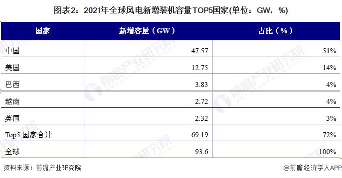 在全球風(fēng)電增速放緩的背景下,中國風(fēng)電裝機(jī)量有所回落。但 2021 年中國風(fēng)電新增裝機(jī)容量仍居全球第一,實(shí)現(xiàn)新增裝機(jī)容量 47.57GW,占全球新增裝機(jī)容量的 51%,其中陸上風(fēng)機(jī)裝機(jī)容量新增 30.67GW,海上風(fēng)機(jī)裝機(jī)容量新增 16.90GW; 其次為美國,新增裝機(jī)容量 12.75GW,占比 14%,全為陸上風(fēng)機(jī) ; 巴西和越南緊隨其后,均占全球風(fēng)電新增裝機(jī)容量的 4%; 英國新增裝機(jī)量 2.32GW,占比也達(dá)到 3%。五大國共計(jì)新增裝機(jī)量 69.19GW,占全球新增裝機(jī)量比重約 72%。