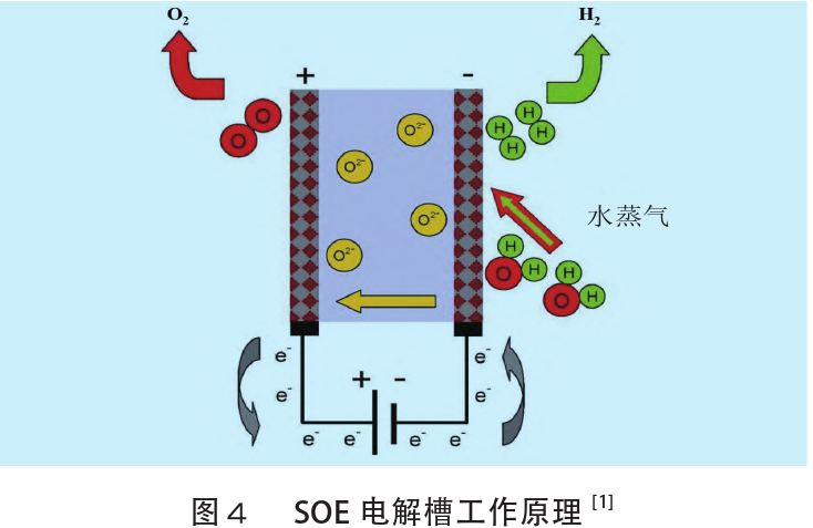 固體氧化物電解槽(SOE)利用高溫水蒸氣(600~900℃)電解,效率高于堿性電解槽和PEM電解槽。20世紀(jì)60年代,美國和德國就開始進(jìn)行SOE高溫水蒸氣的相關(guān)研究。SOE電解槽的工作原理如圖4所示。循環(huán)氫氣和水蒸氣從陽極進(jìn)入反應(yīng)系統(tǒng),水蒸氣在陰極電解成氫氣,陰極產(chǎn)生的O2–通過固體電解質(zhì)移動到陽極,重新結(jié)合形成氧氣并釋放電子。