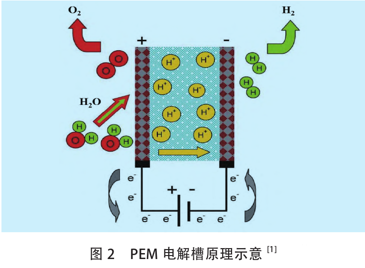 陽極、陰極和膜組構(gòu)成膜電極組件(MEA),電極通常由鉑或銥等貴金屬組成。在陽極,水被氧化產(chǎn)生氧氣、電子和質(zhì)子。在陰極,陽極產(chǎn)生的氧氣、電子和質(zhì)子通過膜循環(huán)到陰極,被還原產(chǎn)生氫氣。PEM電解槽的原理如圖2所示。