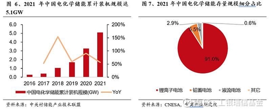 我國電化學(xué)儲(chǔ)能裝機(jī)規(guī)模持續(xù)高速增長,其中鋰電池儲(chǔ)能規(guī)模占比超九成。2021年,中國電化學(xué)儲(chǔ)能累計(jì)裝機(jī)規(guī)模5.1GW,同比增長56.5%,2016-2021年CAGR高達(dá)79.3%。其中,鋰離子電池儲(chǔ)能技術(shù)裝機(jī)規(guī)模4.7GW,裝機(jī)規(guī)模占比91.0%;鉛蓄電池儲(chǔ)能裝機(jī)規(guī)模0.3GW,占比5.5%;液流電池儲(chǔ)能技術(shù)裝機(jī)規(guī)模0.1GW,占比2.9%。
