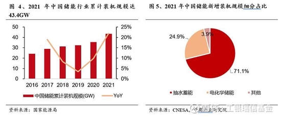 我國儲(chǔ)能市場穩(wěn)步擴(kuò)容,電化學(xué)儲(chǔ)能份額增長明顯。在新能源發(fā)電規(guī)模大幅增長的推動(dòng)下,我國儲(chǔ)能裝機(jī)規(guī)模一直保持高速增長的趨勢。根據(jù)國家能源局?jǐn)?shù)據(jù),2021年中國儲(chǔ)能市場累計(jì)裝機(jī)功率位居全球第一,為43.4GW,同比增長21.9%,2016-2021年儲(chǔ)能累計(jì)裝機(jī)量年均復(fù)合增長率為12.3%。2021年我國抽水蓄能新增裝機(jī)5.2GW,占比71.1%;電化學(xué)儲(chǔ)能新增裝機(jī)1.8GW,占比24.9%,較2020年占比9.2%增幅較大,電化學(xué)儲(chǔ)能市場份額增長明顯。