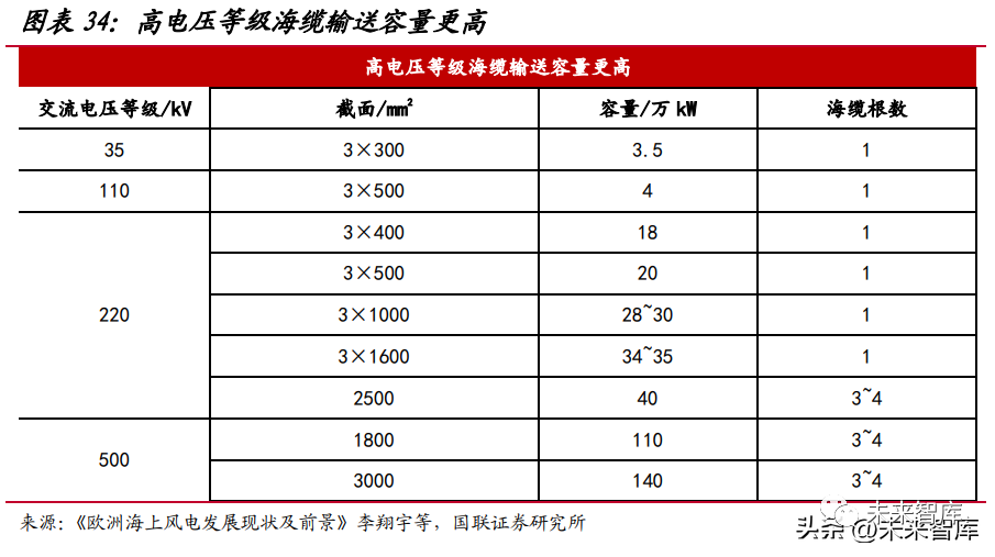 海纜對(duì)耐腐蝕、抗拉耐壓、阻水防水等性能要求更高。與陸纜相比,海纜鋪設(shè)于 海底,水下情況復(fù)雜,需要承受較大水壓,因此必須具有良好的阻水和機(jī)械性能,防 止水分滲透導(dǎo)致海纜發(fā)生故障,也需要具備良好的機(jī)械性能為、防止船只錨害和洋流 沖刷,此外海纜還需具有防腐蝕、防海洋生物的能力,保障壽命。海纜趨勢一:離岸距離、大兆瓦風(fēng)機(jī)驅(qū)動(dòng)使用高電壓等級(jí)海纜。過去國內(nèi)已并網(wǎng) 的海上風(fēng)電項(xiàng)目離岸距離較近(30km 以內(nèi)),均采用交流海纜送出方式,但隨著風(fēng)機(jī) 大型化、項(xiàng)目向深遠(yuǎn)海延伸過去,35kV、110kV 交流海纜受輸送容量限制,同時(shí)鋪設(shè) 海纜根數(shù)多對(duì)海底走廊有很高占用,輸電損耗也較大。同輸電功率的情況下,電壓越高電流就越小,高壓輸電能減少輸電時(shí)的電流從而降低因電流產(chǎn)生的熱損耗和降低遠(yuǎn) 距離輸電的材料成本。國內(nèi)目前主流交流海纜電壓等級(jí)為 220kV,采用單回三芯結(jié)構(gòu), 輸電能力在 18~35 萬 kW,高電壓等級(jí)(更高 220kV、500kV)輸電能力顯著提高。