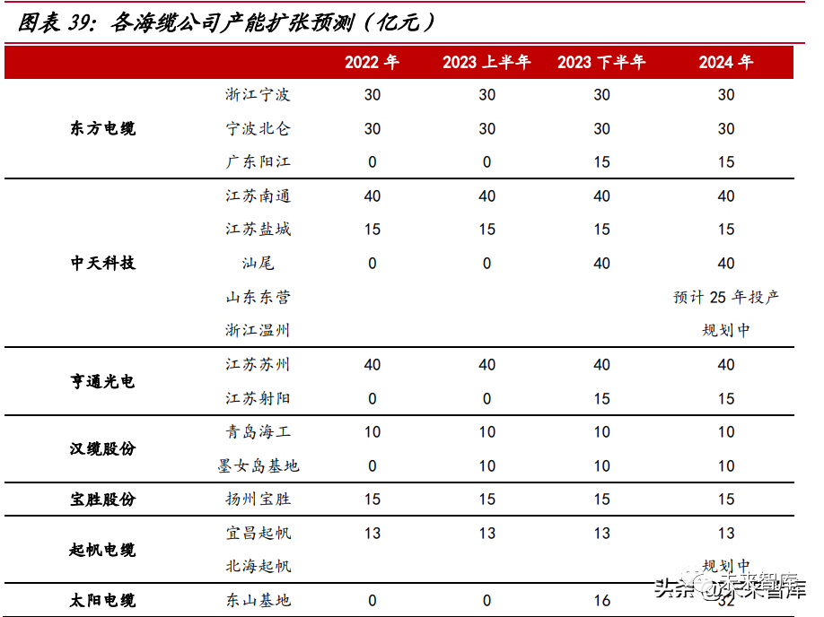 疫情因素減弱,疊加海纜較高的毛利率,海纜企業(yè)擴(kuò)大產(chǎn)能的動(dòng)機(jī)較強(qiáng)。東方電 纜陽江基地、中天科技(維權(quán))汕尾基地和亨通光電射陽基地 2023 年下半年投產(chǎn),預(yù)計(jì)分別 擴(kuò)大產(chǎn)能 15 億、40 億和 15 億;漢纜股份墨女島已建成,投產(chǎn)時(shí)間預(yù)計(jì)在 23 年初, 擴(kuò)產(chǎn)可達(dá) 10 億;太陽電纜正在建設(shè)東山海纜生產(chǎn)基地,產(chǎn)能可達(dá) 32 億。