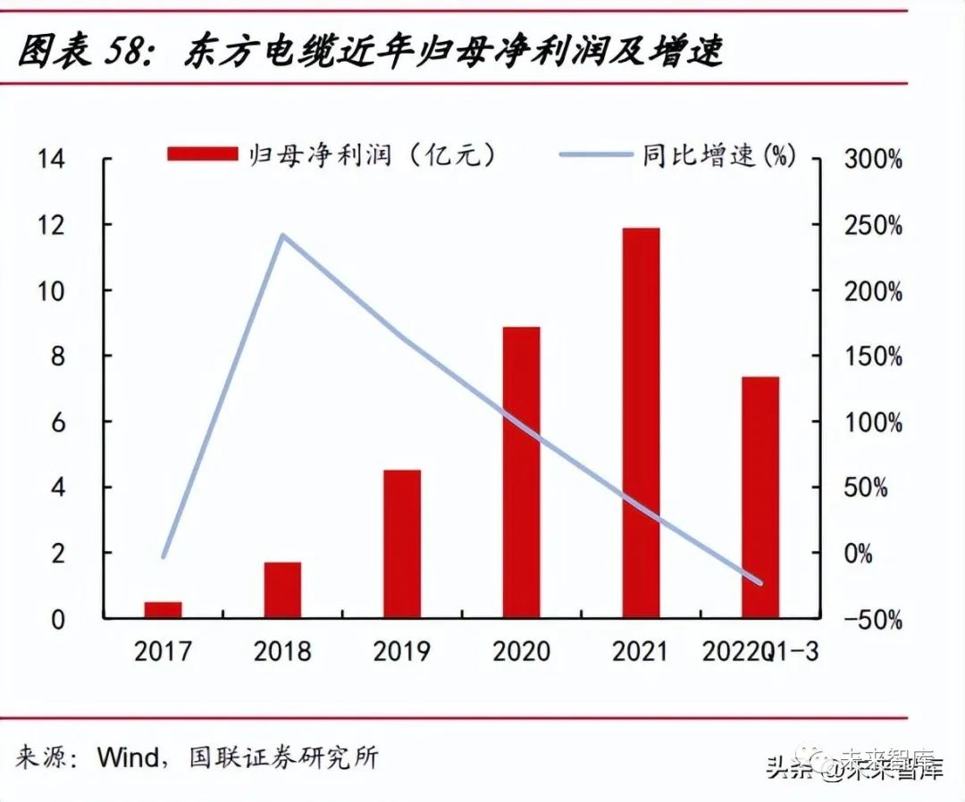 產(chǎn)能布局鞏固龍頭地位,在手訂單飽滿。公司積極布局南方市場,位于北侖和陽 江的兩大基地,有望助力公司提升在浙江、廣東等地區(qū)的優(yōu)勢。截至 2022 年 10 月27 日,公司在手訂單 94.4 億元,其中海纜系統(tǒng) 58.1 億元,陸纜系統(tǒng) 23.7 億元、海 洋工程 12.7 億元,同比增加 48%。在手訂單結(jié)構(gòu)中,毛利率較高的海洋板塊占比提 升明顯,未來公司盈利能力有望隨著產(chǎn)品結(jié)構(gòu)改善以及海纜需求回暖迎來提升。我們預(yù)計(jì) 2022-24 年公司歸母凈利潤分別為 9.61/18.86/23.44 億元(原值為 12.68 /17.46/23.38 億 元 ), 同 比 -19.18%/96.34%/24.26% , EPS 分 別 為 1.40/2.74/3.41 元/股。