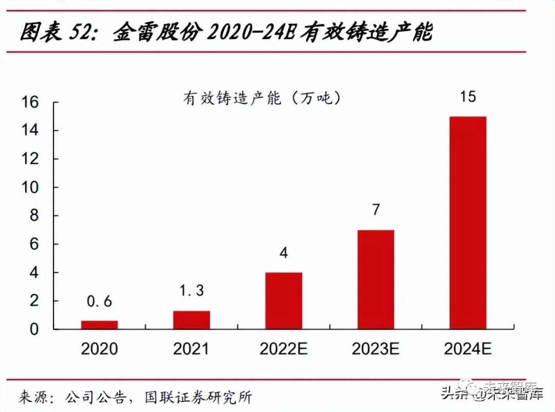 海風(fēng)引領(lǐng)主軸鍛改鑄趨勢。風(fēng)機(jī)大型化趨勢下主軸鑄造工藝趨勢明確,隨著大 型海上風(fēng)機(jī)主軸尺寸越來越大,鍛造主軸因?yàn)樯a(chǎn)設(shè)備的限制,不適用于大型風(fēng)機(jī);同時(shí)直驅(qū)和半直驅(qū)機(jī)型份額占比增加,主軸在中低速傳動(dòng)工況下相比于雙饋高速傳 動(dòng)性能要求略有降低,部分風(fēng)電整機(jī)供應(yīng)商基于降本壓力及輕量化的需求,鑄造主 軸占比將有望提升。龍頭金雷股份(44.320, -1.12, -2.46%)優(yōu)勢明顯。金雷股份東營海上風(fēng)電核心部件數(shù)字化制造項(xiàng)目也在 持續(xù)推進(jìn)中,項(xiàng)目規(guī)劃鑄造產(chǎn)能共 40 萬噸,目前一期工程已開工建設(shè),規(guī)劃產(chǎn)能 10 萬噸,預(yù)計(jì)將于 2023 年中旬投產(chǎn),貢獻(xiàn) 50%的產(chǎn)能,2023 年預(yù)計(jì)公司鑄造產(chǎn) 能有望達(dá)到 7-8 萬噸,2024 年有望達(dá)到 15 萬噸。