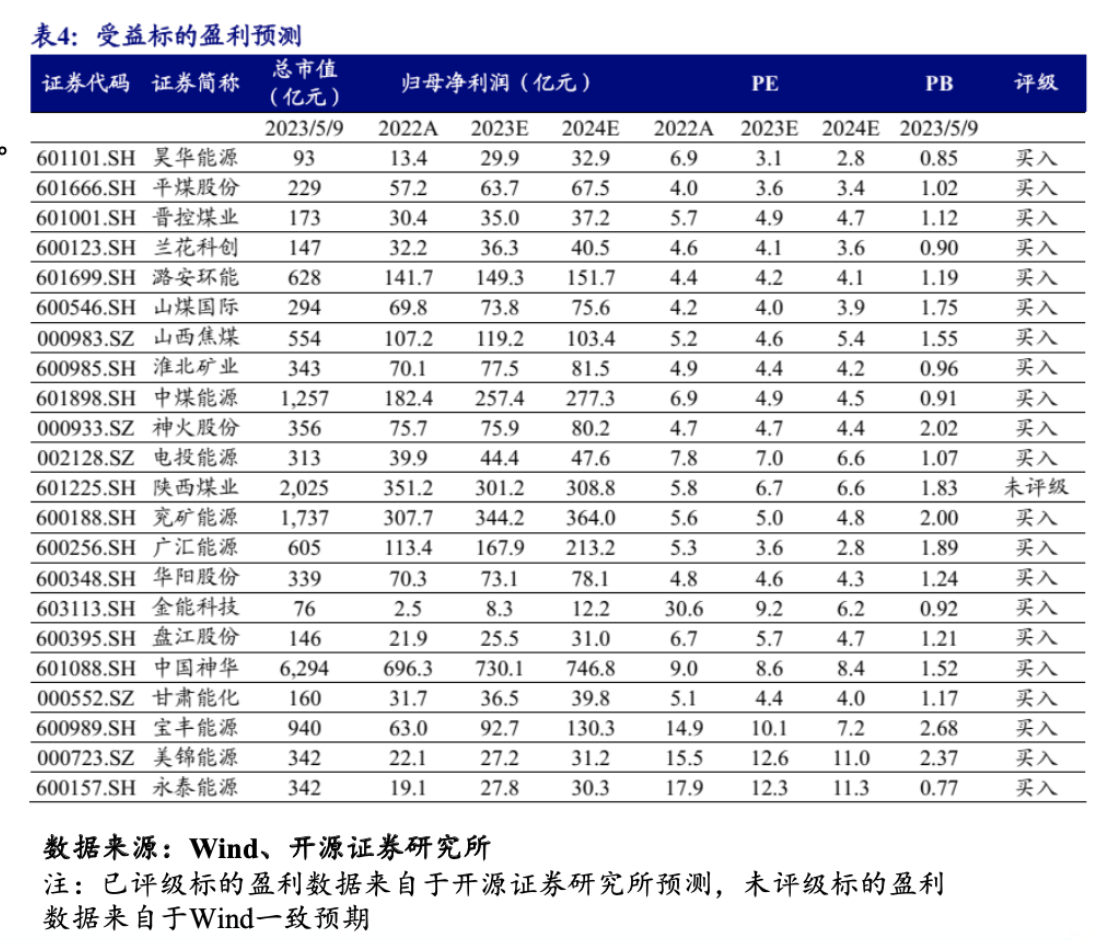 根據(jù)開源證券梳理,煤企四種能源轉型途徑分別為,高分紅兼具高彈性的雙重受益標的(前四再疊加高成長):山西焦煤、廣匯能源、兗礦能源、潞安環(huán)能、山煤國際;經(jīng)濟復蘇及冶金煤彈性受益標的:平煤股份、淮北礦業(yè)(含轉債)、神火股份(煤鋁);穩(wěn)健高分紅受益標的:中國神華、陜西煤業(yè);中特估預期差最大受益標的:中煤能源;能源轉型受益標的:華陽股份、美錦能源(含轉債)、電投能源、永泰能源。