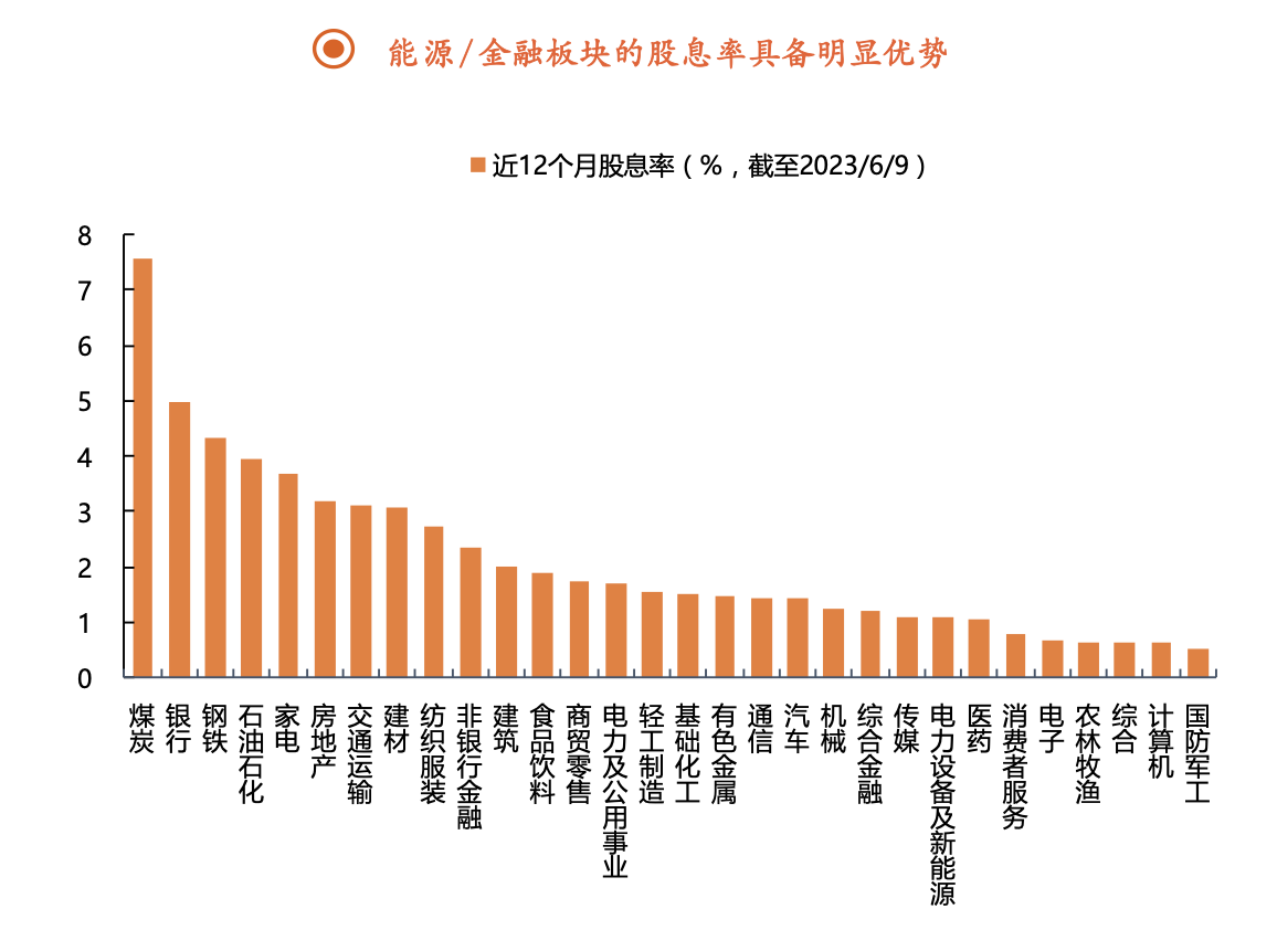 與此同時,平安證券研報指出,在“中特估+分紅”細分主線下能源領域有望顯著受益。根據(jù)近12個月股息率(截至2023/6/9),能源股息率具備明顯優(yōu)勢,煤炭、鋼鐵、石油化工股息率均位列前五。