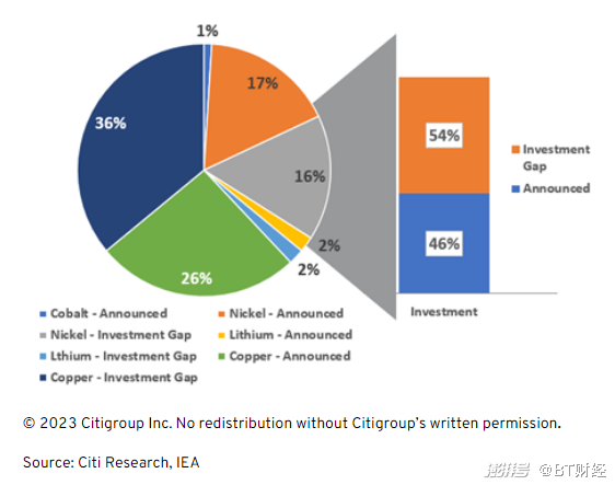 根據(jù)國際能源署(IEA)的數(shù)據(jù),關(guān)鍵礦產(chǎn)所需的投資在3600億至4500億美元之間??紤]到已宣布的項(xiàng)目,目前的投資缺口為54%,即1940億美元至2430億美元。目前,投資缺口最大的礦產(chǎn)是銅,占36%,其次是鎳,占16%。